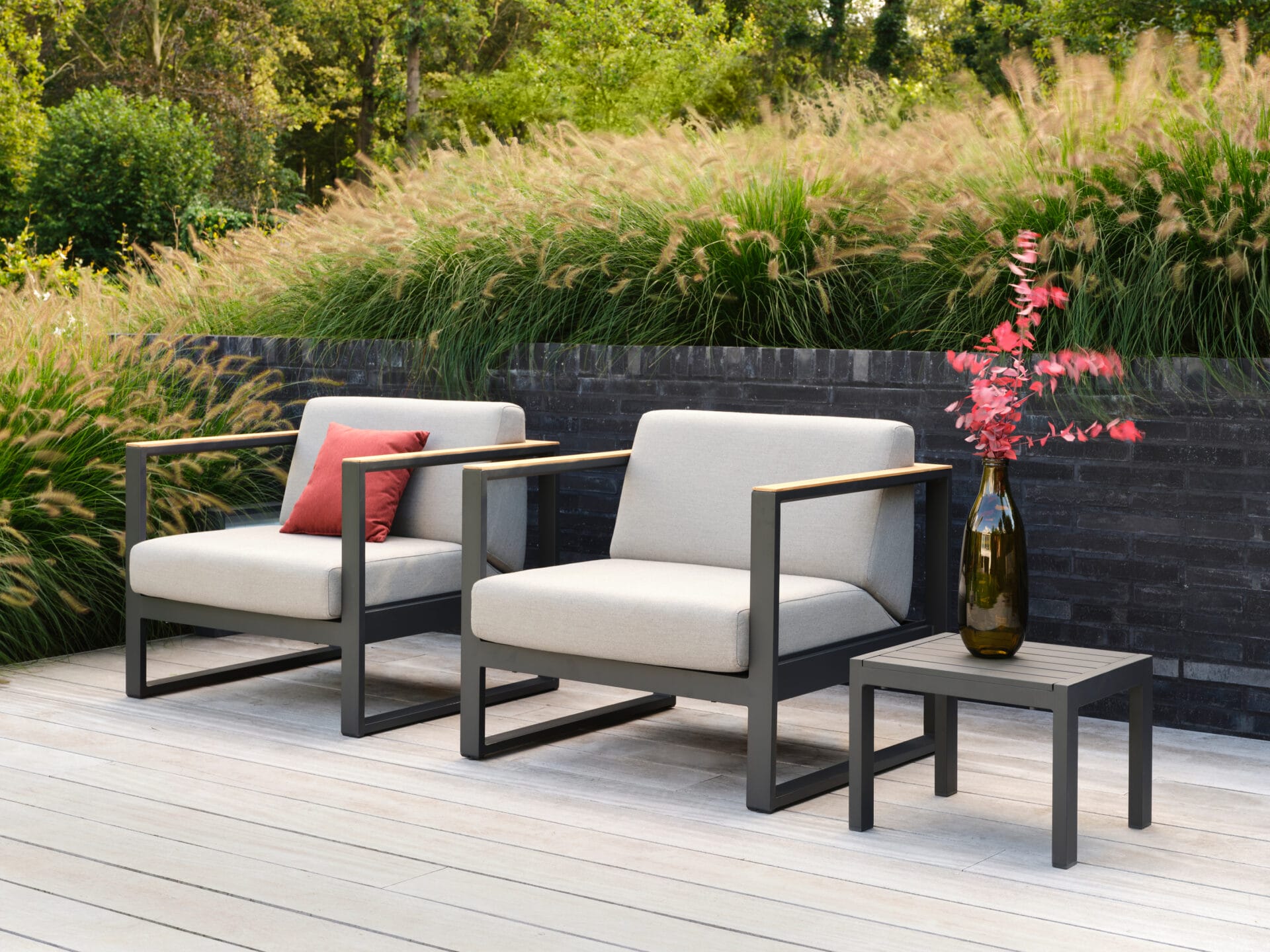 Powder-Coated Aluminum Frame | FSC Teak Armrest Detail | Sunbrella® Performance Fabric